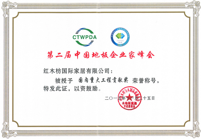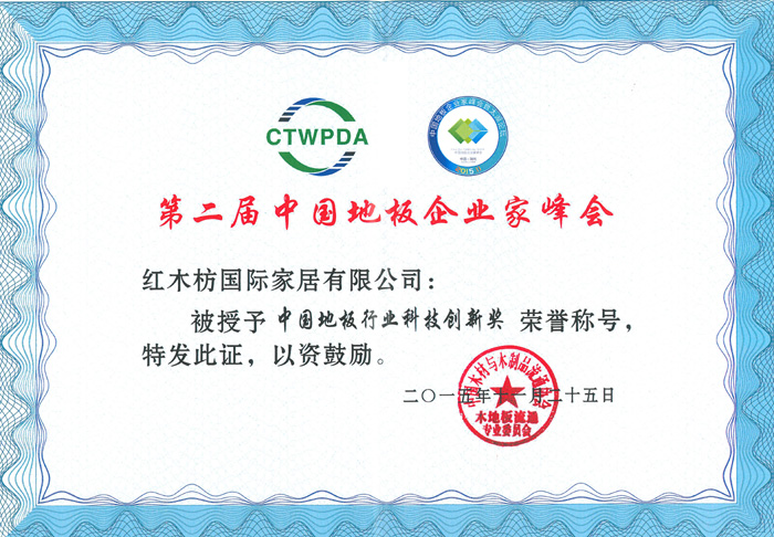 2015年11月25日,由中國木材與木制品流程協(xié)會主辦,主題為“審時度勢和衷共濟”第二屆中國地板企業(yè)家峰會在浙江湖州開元名都大酒店隆重召開。來自全國各地200余家優(yōu)秀企業(yè)家及業(yè)界專家代表出席本次會議。紅木枋地板作為行業(yè)新秀應(yīng)邀參加本次高峰會議。并獲得“中國地板行業(yè)科技創(chuàng)新獎”和“國內(nèi)重大工程貢獻獎”兩項殊榮。這是行業(yè)對紅木枋地板的最高禮遇,也是激勵紅木枋地板實現(xiàn)夢想,不斷前進的利器。